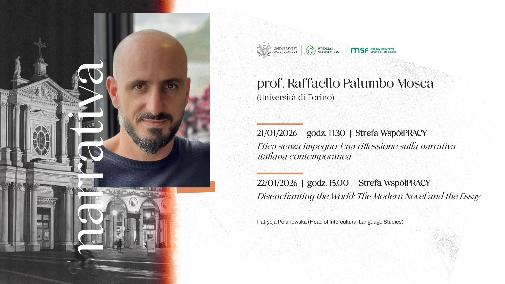 Prof. Raffaello Palumbo Mosca jest uznanym badaczem literatury współczesnej. Wykłady stanowią doskonałą okazję do zapoznania się z aktualnymi kierunkami badań nad nowoczesną prozą europejską.